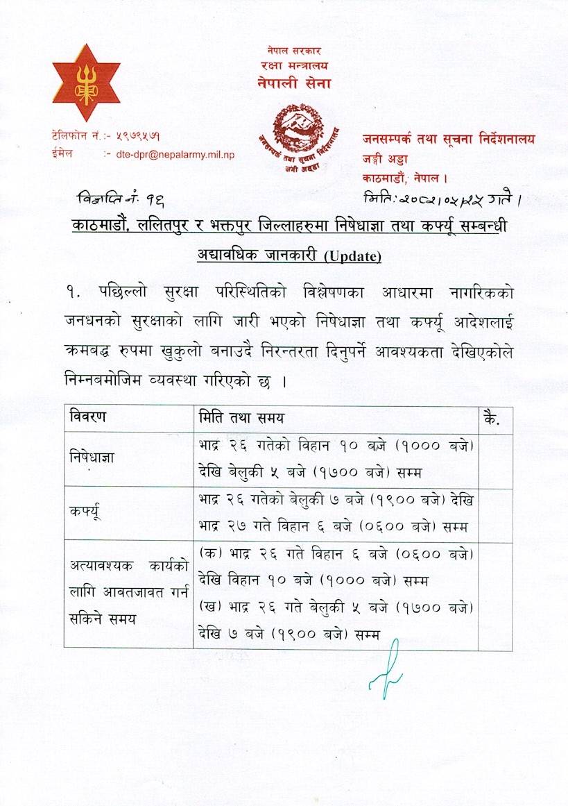 नयाँ व्यवस्था अनुसार भाद्र २६ गते विहान १० बजे देखि बेलुकी ५ बजे सम्म र भाद्र २६ गते बेलुकी ७ बजे देखि भाद्र २७ गते विहान ६ बजे सम्म कर्फ्यू जारी रहनेछ। यस क्रममा आवश्यक कार्यका लागि सीमित आवतजावत अनुमति दिइनेछ।