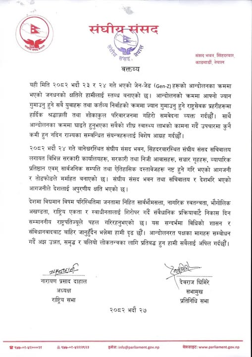 राष्ट्रिय सभा अध्यक्ष नारायण प्रसाद दाहाल र प्रतिनिधि सभा सभामुख देवराज घिमिरेद्वारा हस्ताक्षरित वक्तव्यमा राष्ट्रपति संवैधानिक प्रक्रियामार्फत निकास दिन पहल गरिरहनुभएको उल्लेख छ।“देशमा विद्यमान विषम परिस्थितिमा नागरिक स्वतन्त्रता, भौगोलिक अखण्डता, राष्ट्रिय एकता र स्वाधीनतालाई शिरोपर गर्दै अघि बढ्नुपर्छ,” वक्तव्यमा भनिएको छ, “विधिको शासन र संविधानवादबाट बाहिर जानु हुँदैन भन्नेमा हामी दृढ छौं।” संसदले आन्दोलनरत पक्षको माग सम्बोधन गर्दै अझ समावेशी, समृद्ध र बलियो लोकतन्त्र निर्माण गर्न सबै दल र पक्षहरूलाई प्रतिबद्ध हुन अपिल गरेको छ।