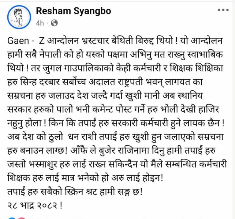 काठमाडौं । जेनजी आन्दोलनका क्रममा सार्वजनिक सम्पत्ति क्षति हुँदा खुशी मनाउने र “अब स्थानीय सरकारहरूको पालो” भन्दै सामाजिक सञ्जालमा विवादास्पद पोस्ट गर्ने जुगल गाउँपालिकाका कर्मचारी तथा शिक्षकलाई तत्काल राजीनामा दिन गाउँपालिकाले निर्देशन दिएको छ।