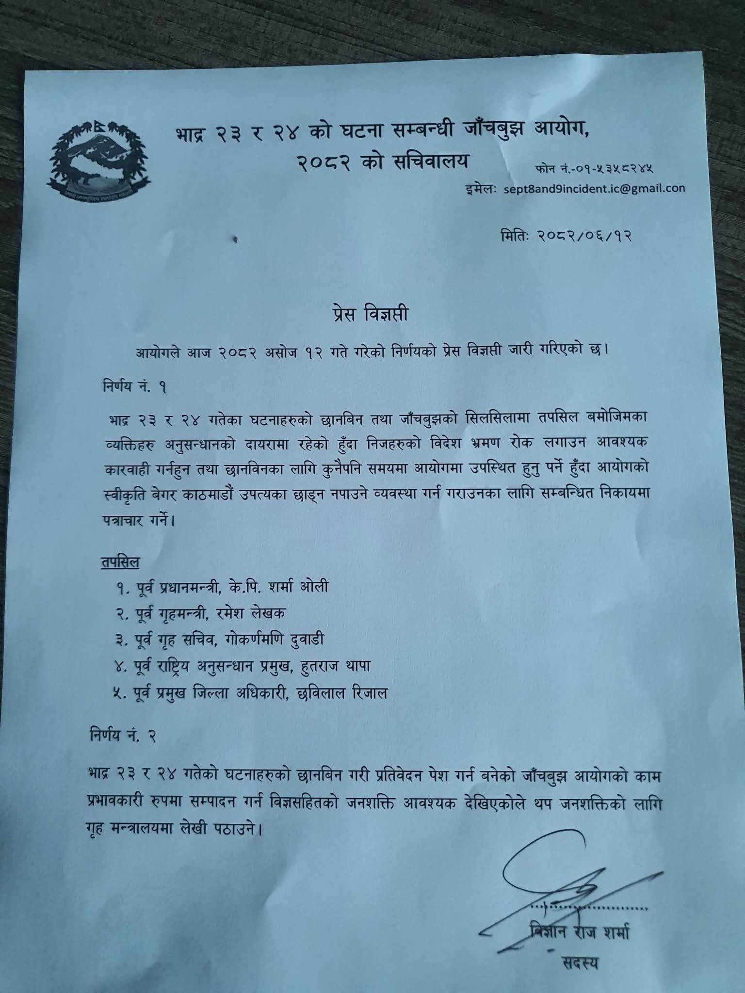 काठमाडौँ । जेनजी आन्दोलनको घटना छानबिनका लागि गठित जाँचबुझ आयोगले पूर्वप्रधनमन्त्री केपी शर्मा ओली, पूर्वगृहमन्त्री रमेश लेखकसहित ५ जनाको विदेश भ्रमणमा रोक लगाउन र काठमाडौं उपत्यका छाड्न नपाउने व्यवस्था मिलाउन सिफारिस गरेको छ ।