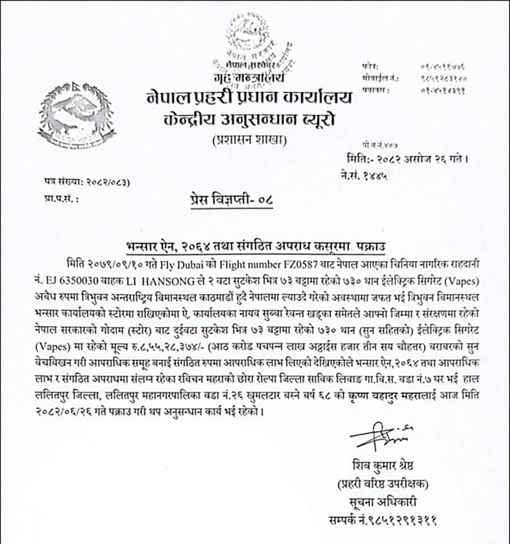 विज्ञप्तिमा महराले २०७९ पुष १० गते दुबईबाट नेपाल आएका चिनियाँ नागरिक ली हानसोङ्गले दुईवटा सुटकेसभित्र ७३ बट्टामा रहेको ७३० इलेक्टिक सिगरेट अवैध रूपमा त्रिभुवन विमानस्थल हुँदै नेपाल ल्याउँदै गरेको अवस्थामा जफत भएकामा त्यसलाई बेचबिखन गरी लाभ लिएको आरोप छ ।