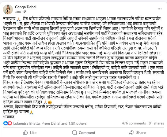 गंगाले सामाजिक सञ्जालमार्फत राजीनामा सार्वजनिक गर्दै लेखेकी छिन्— “मलाई देखाएर लगातार बुवा प्रचण्ड र सिंगो पार्टीमाथि योजनाबद्ध प्रहार भइरहेकाले संयोजकको सचिवालयबाट राजीनामा दिएकी छु।” उनले भनेकी छिन् कि आफू पार्टीकी “जिम्मेवार कार्यकर्ता”को हैसियतमा निरन्तर रूपमा सक्रिय रहनेछिन्। “सचिवालयमा रहँदा पार्टीका नेताहरू, कार्यकर्ताहरू र आम नागरिकले देखाएको विश्वास र सहयोगका लागि म आभारी छु,” गंगाले राजीनामा सन्देशमा लेखेकी छिन्।