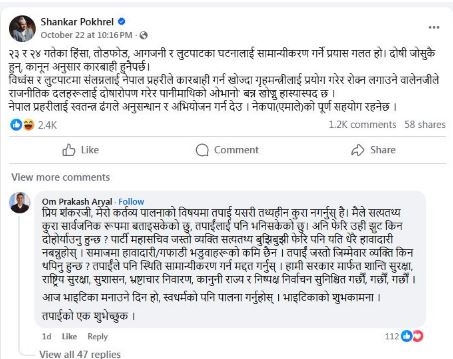 एमाले महासचिव पोखरेलले आफ्नो फेसबुकमा लेखेका थिए — “२३ र २४ गतेको हिंसा, तोडफोड र आगजनीका घटनालाई सामान्यीकरण गर्ने प्रयास गलत हो। नेपाल प्रहरीले कारबाही गर्न खोज्दा गृहमन्त्रीलाई प्रयोग गरेर रोक्ने प्रयास भएको छ।” पोखरेलको संकेत स्पष्ट थियो — गृह मन्त्रालय र काठमाडौंका मेयर बालेन शाहबीच ‘राजनीतिक मिलेमतो’ भएको आरोप। तर केही घण्टामै गृहमन्त्री अर्यालले सोही पोस्टमा कडा टिप्पणी गर्दै प्रतिवाद गरे। उनले लेखे — “प्रिय शंकरजी, मेरो कर्तव्यपालनाको विषयमा तपाईंले यसरी तथ्यहीन कुरा नगर्नुस्। मैले सत्यतथ्य सार्वजनिक गरिसकेको छु। झुट कुरा दोहोर्याउनु तपाईंको हैसियतअनुसार शोभनीय छैन।”अर्यालको जवाफमा भावनात्मक तिखोपन मात्र थिएन, राजनीतिक चेतावनी पनि थियो —“समाजमा हावादारी र रगफाडी भँडुवाहरूको कमी छैन, तपाईं त्यसमा नथपिनुस्।”