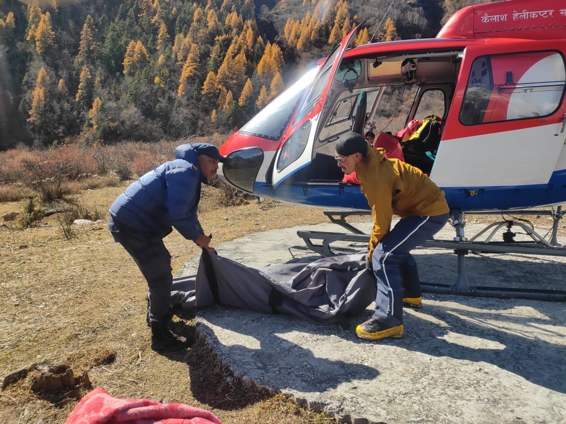 आरोहीको शव हेलिकोप्टरमार्फत सामागाउँ ल्याइएको छ । पाङबारीे हिमालबाट फर्कने क्रममा तीन इटालियन नागरिक र एक नेपाली सहयोगी गत बुधबारदेखि पहिलो शिविर र आधार शिविरमा अलपत्र परेका थिए । फरिनातो र गापुटो हिमाल आरोहण गर्न नसकेपछि फर्कने क्रममा हिमपातका कारण अलपत्र परेका बताइएको छ ।