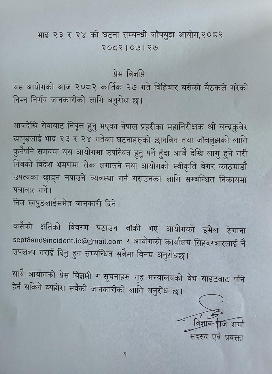 भदौ २३ र २४ गतेको घटना सम्बन्धि जाँचबुझ आयोगले खापुङलाई आजदेखि लागु हुने गरि कुनै पनि समय आयोगमा उपस्थित हुनुपर्ने भएकाले विदेश भ्रमण र आयोगको स्वीकृत बेगर काठमाडौँ उपत्यका छोड्न नपाउने निर्णय गरेको आयोगक सदस्य विज्ञान राज शर्माले जानकारी दिएका छन् ।