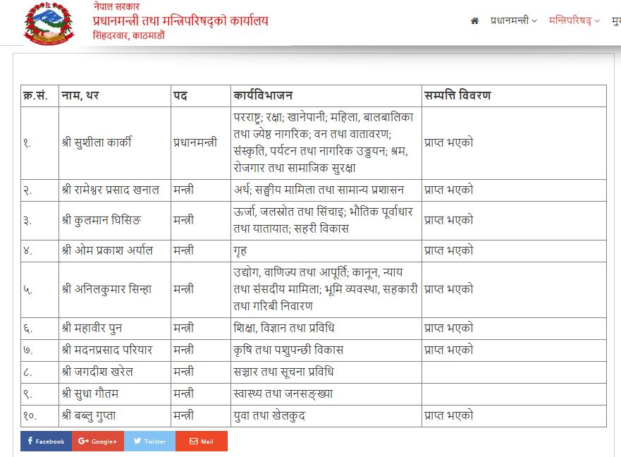 काठमाडौं। प्रधानमन्त्री सुशीला कार्की नेतृत्वको मन्त्रिमण्डलका १० मध्ये ८ मन्त्रीले आफ्नो सम्पत्ति विवरण सार्वजनिक गरेका छन्। प्रधानमन्त्री तथा मन्त्रिपरिषद्को कार्यालयका अनुसार दुई मन्त्रीले भने अझै विवरण बुझाउन बाँकी छ।