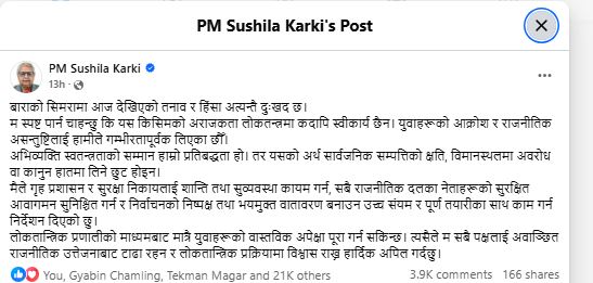 प्रधानमन्त्री कार्कीका अनुसार युवाहरूको आक्रोश र राजनीतिक असन्तुष्टिलाई सरकार गम्भीरतापूर्वक लिन्छ तर अभिव्यक्ति स्वतन्त्रताको नाममा सार्वजनिक सम्पत्ति तोडफोड, विमानस्थलमा अवरोध वा कानुन हातमा लिने कार्य स्वीकार्य नहुने उनले स्पष्ट पारिन् ।