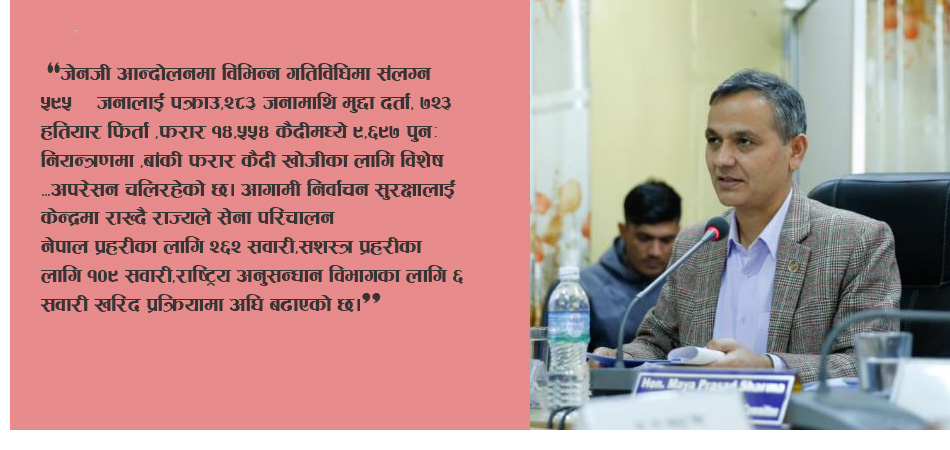 द्वन्द्व दोहोरिन नदिने वातावरण काबुमा रहेको दाबी,राजनीतिक दल र जेएन (जी)समूहसँग संवादको प्रक्रिया चलिरहेको, निर्वाचन निष्पक्ष र शान्तिपूर्ण बनाउन सरकार प्रतिबद्ध, लुटिएका हतियारहरू फिर्ता लिने काम छिटो गतिमा, प्रहरीको मनोबल तथा क्षतिग्रस्त कार्यालय पुनर्निर्माणमा नागरिक सहयोग प्राप्त भएको मन्त्री अर्यालले बताए । उनले अहिलेसम्म—५९५ जनालाई पक्राउ,२८३ जनामाथि मुद्दा दर्ता, ७२३ हतियार फिर्ता फरार १४,५५४ कैदीमध्ये ९,६९७ पुनः नियन्त्रणमा ल्याइएको बताए। बाँकी फरार कैदी खोजीका लागि विशेष ‘अपरेसन’ चलिरहेको छ।