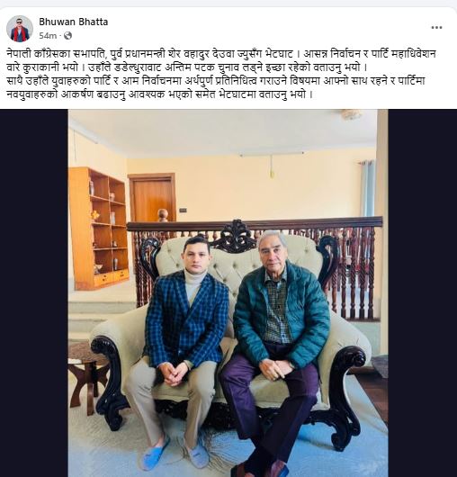 गत साता देउवालाई भेट्न महाराजगञ्ज पुगेका सुदूरपश्चिमका एक केन्द्रीय सदस्यले पनि देउवाले चुनाव लड्ने इच्छा स्पष्ट गरेका थिए। ‘साथीहरूले तपाईं नै उठ्नुपर्छ भनेका छन्। म उठ्छु भन्ने उत्तर पाइएको छ,’ उनले बताए। मंगलबार बिहान भेटेका नेविसंघका नेता भुवन भट्टले समेत देउवाले यसपटक अन्तिमपटक प्रतिस्पर्धामा उत्रने जानकारी आफूलाई दिएको बताए।