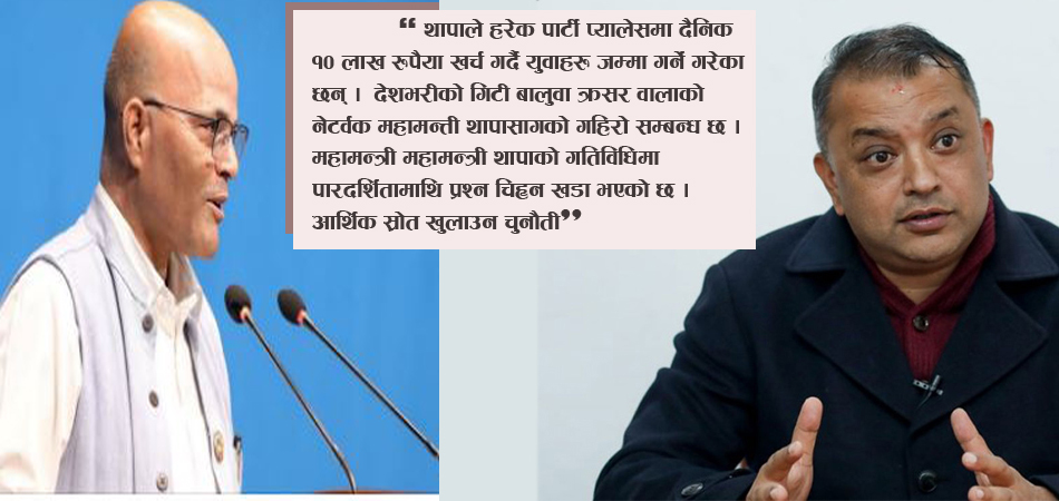 नेता सिंहले महामन्त्री थापाले हरेक पार्टी प्यालेसमा दैनिक १० लाख रुपैया खर्च गर्दै युवाहरु जम्मा गर्ने गरेको दाबी गर्दै त्यसको स्रोत खुल्नुपर्ने उल्लेख गरेका छन् । देशभरीको गिटी बालुवा क्रसर वालाको नेटर्वक महामन्त्ती थापासँग भएको उल्लेख गर्दै उनले भने,‘ उनले दश,बीस जना प्रोसर,डाक्टर इन्जिनियर उसको पक्षमा उभ्याइदियोस्,तर त्यो छैन् उनको पक्षमा उभिनेहरु जम्मैँ गिटी क्रसरवाला,जम्मैँ बालुवा तस्करीवाला ,जम्मैँ जग्गा दलाली गर्नेवाला जम्मैँ दुई नम्बरी गर्नेवाला मात्र नेटवर्कमा छ ।थापाले देश तथा विदेशी नेटर्वकबाट पैसा लिएर पार्टी कब्जा गर्ने प्रशस्त ठाउँ र आधार भएको उनले खुलासा गरेका छन् ।