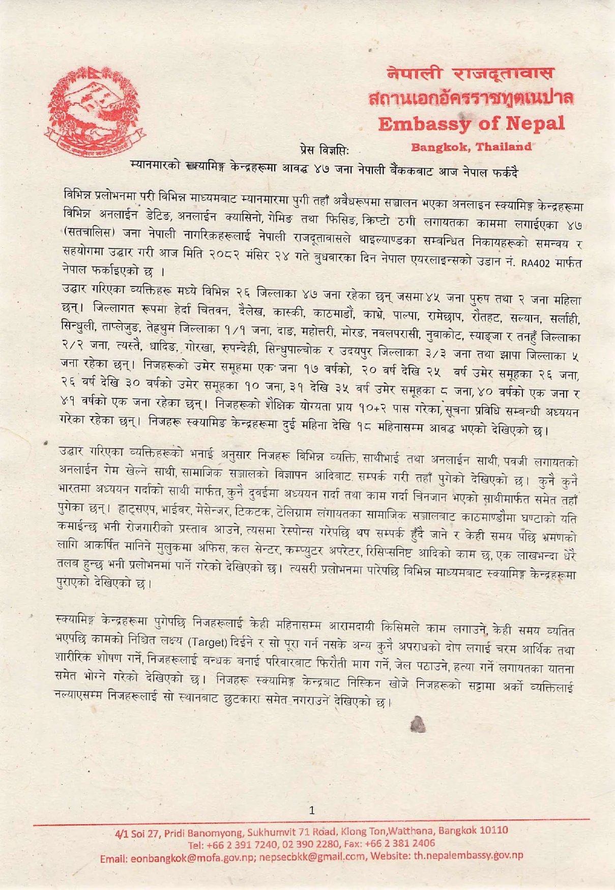 अनलाइन डेटिङ, अनलाइन क्यासिनो, गेमिङ तथा फिसिङ, क्रिप्टो ठगी लगायतका काममा लगाइएका २६ जिल्लाका ४७ जना नेपालीको उद्धार गरिएको दूतावासले जनाएको छ । जसमा ४५ पुरुष तथा २ जना महिला छन् ।