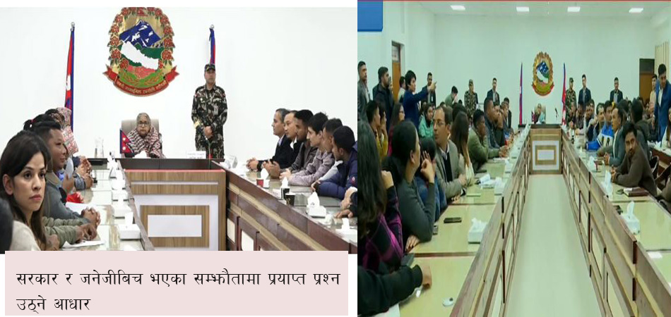 त्यही पृष्ठभूमिमा जेनजीका केही समूहले आन्दोलनका मुद्दालाई संस्थागत रूप दिन सरकारसँग संवाद थालेका थिए। के–कस्ता विषयलाई दस्तावेजीकरण गर्ने भन्नेमा लामो समयसम्म सहमति जुट्न सकेको थिएन। तीन महिनासम्मको रस्साकस्सी र आन्दोलन अपराधीकरण हुँदै गएको गुनासोपछि अन्ततः दुवै पक्ष औपचारिक सम्झौतामा पुगेका हुन्। सम्झौता ढिला भए फेरि सडक संघर्षमा फर्किने चेतावनीसमेत जेनजीले दिएका थिए। उनीहरूले सरकारलाई आफ्नै तर्फबाट सम्झौताको मस्यौदा बुझाएपछि पटक–पटक छलफल हुँदै अन्तिम रूप दिइएको हो।