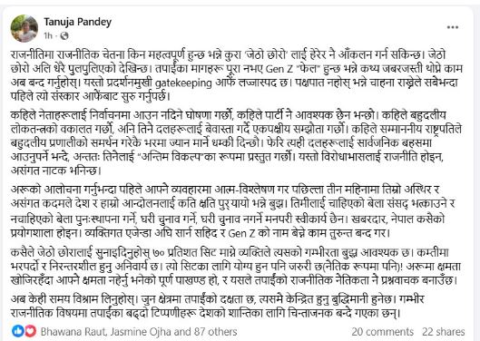 जेनजी आन्दोलनकी अगुवा तनुजा पाण्डेले गुरुङविरुद्ध सामाजिक संचालमा गरेको पोष्ट यस्तो छ :