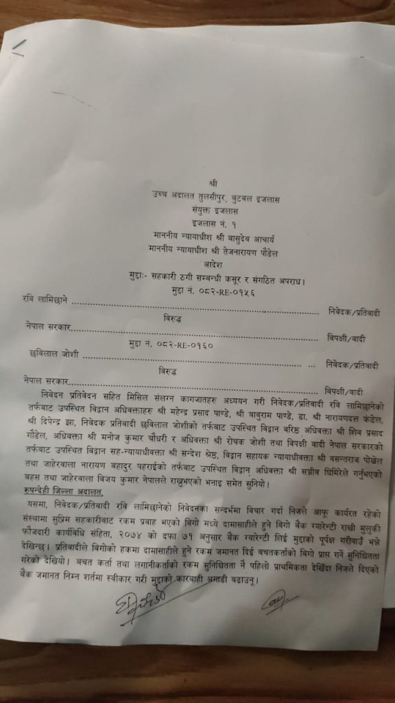 उच्च अदालत तुलसीपुर बुटवल इजलासका न्यायाधीश वासुदेव आचार्य र तेजनारायण पौडेलको इजलासले अदालतबाट अन्तिम फैसला हुँदा ठहरे बमोजिम हुने नै हुँदा बिगोका हकमा थप दायित्व सृजना गरेमा र तिर्न बुझाउन मञ्जुर भए सो को कागज गरी प्रतिवादी रवी लामिछानेलाई सुप्रिम सहकारीको रकम ठगी मुद्दाको रोहबाट थुनामुक्त गर्नु भनी आदेश भएको अदालतका सूचना अधिकारी रामबहादुर कुँवरले जानकारी दिए।