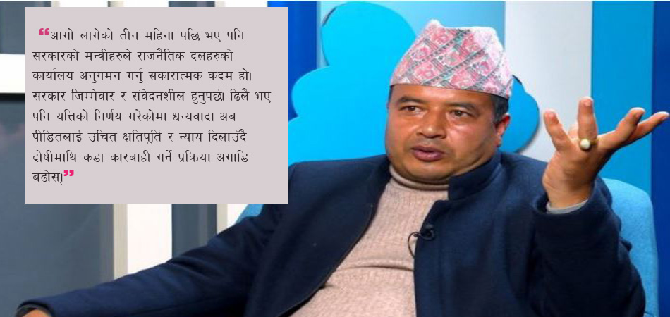 काठमाडौं । नेकपा एमालेका नेता तथा केन्द्रीय सचिव महेश बस्नेतले जेनजी आन्दोलनपछि आगलागीका घटनामा क्षतिग्रस्त राजनीतिक दलको कार्यालयमा सरकारले गरेको अनुगमनको कदमलाई सकारात्मक रुपमा मूल्याङ्कन गरेका छन्। बस्नेतले भने, “आगो लागेको तीन महिना पछि भए पनि मन्त्रीहरुले अनुगमन गर्नु स्वागतयोग्य छ। सरकार जिम्मेवार र संवेदनशील हुनुपर्छ।”