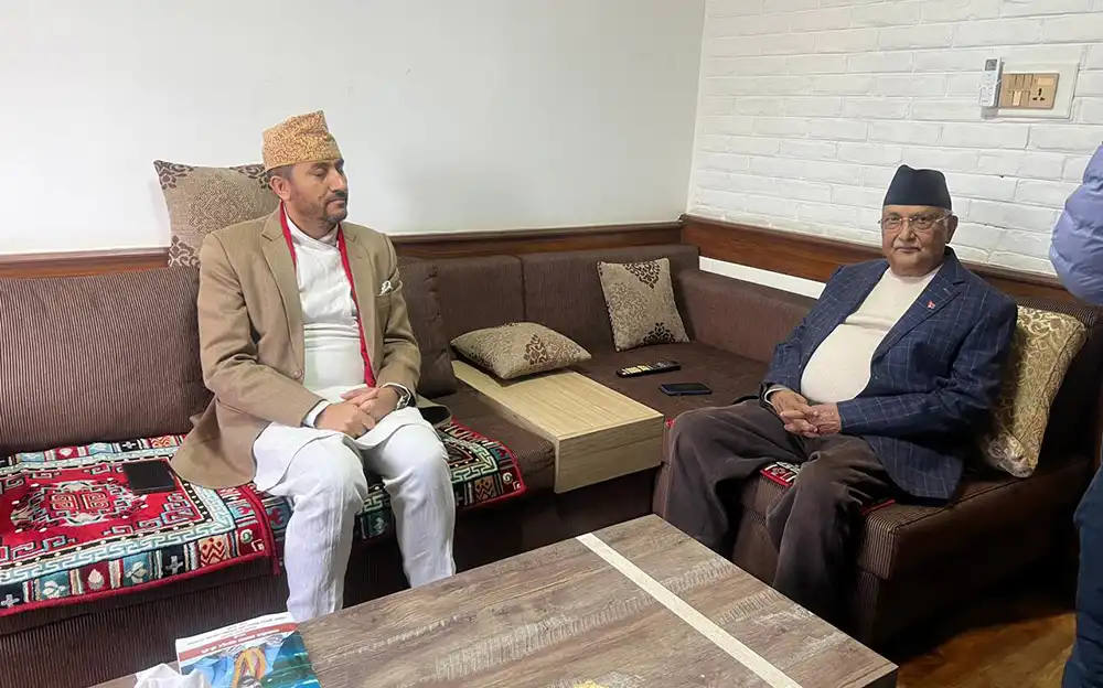 काठमाडौँ। सूचना तथा सञ्चार प्रविधिमन्त्री जगदीश खरेलले नेकपा एमालेका अध्यक्ष केपी शर्मा ओलीसँग भेटवार्ता गरेका छन् ।शुक्रबार भक्तपुरको गुण्डुस्थित निवासमा पुगेर सञ्चारमन्त्री खरेलले ओलीसँग भेटवार्ता गरेका हुन् । भेटमा आसन्न चुनाव र समसामयिक विषयमा छलफल भएको बताइएको छ ।