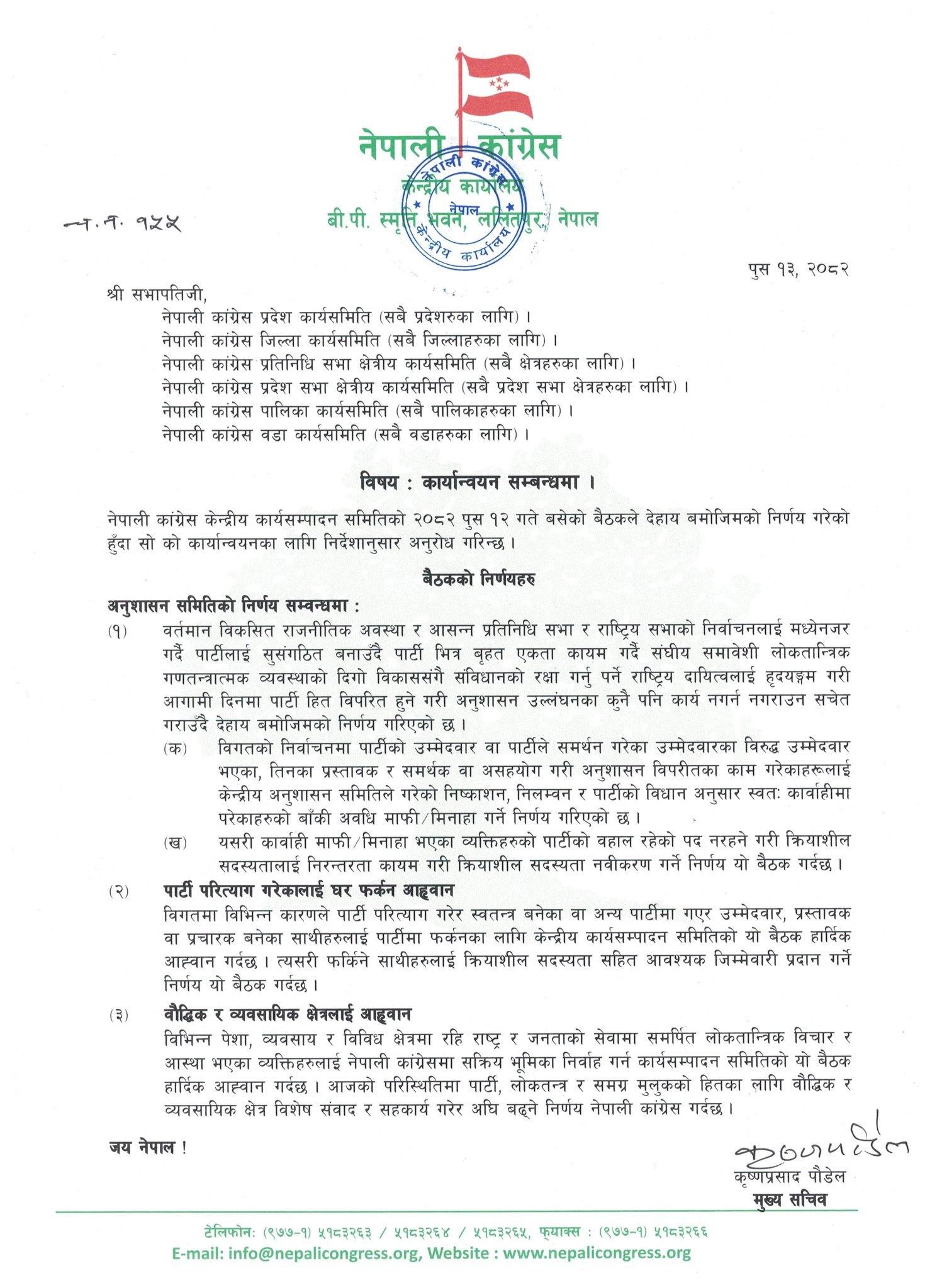 कांग्रेसले आज एक विज्ञप्तिमार्फत पार्टीका सबै प्रदेश, जिल्ला, प्रतिनिधिसभा र प्रदेश क्षेत्रीय कार्यसमिति, पालिका कार्यसमिति र वडा कार्यसमितिलाई सम्बोधन गरी उक्त निर्णय कार्यान्वयन गर्न निर्देशन जारी गरेको हो ।