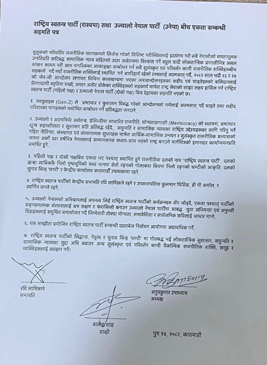 यसअघि पार्टी सभापतिमा रवि लामिछाने र प्रधानमन्त्रीको उम्मेदवारमा बालेन्द्र शाह (बालेन) रहने सहमति भइसकेको थियो। सोमबार काठमाडौंमा भएको अन्तिम चरणको भेटवार्तापछि दुवै पक्षबीच सहमति कायम भएको स्रोतको दाबी छ। यस सहमतिलाई रास्वपाको आन्तरिक शक्ति सन्तुलन र आगामी निर्वाचन रणनीतिका हिसाबले महत्वपूर्ण मानिएको छ।