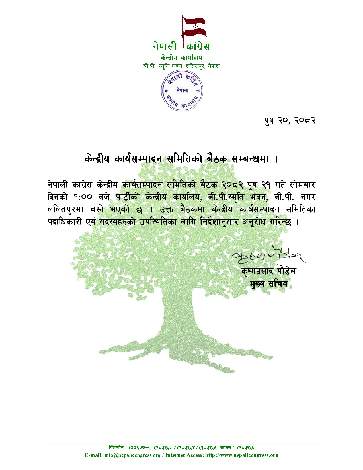 पार्टी केन्द्रीय कार्यालय सानेपा, ललितपुरमा दिउँसो १ बजे बस्ने बैठकमा कांग्रेसको १५औँ महाधिवेशन, आसन्न राष्ट्रियसभा र प्रतिनिधिसभा सदस्य निर्वाचनलगायत समसामयिक विषयमा छलफल हुने पार्टी कार्यालयका मुख्यसचिव कृष्णप्रसाद पौडेलले जानकारी दिए ।