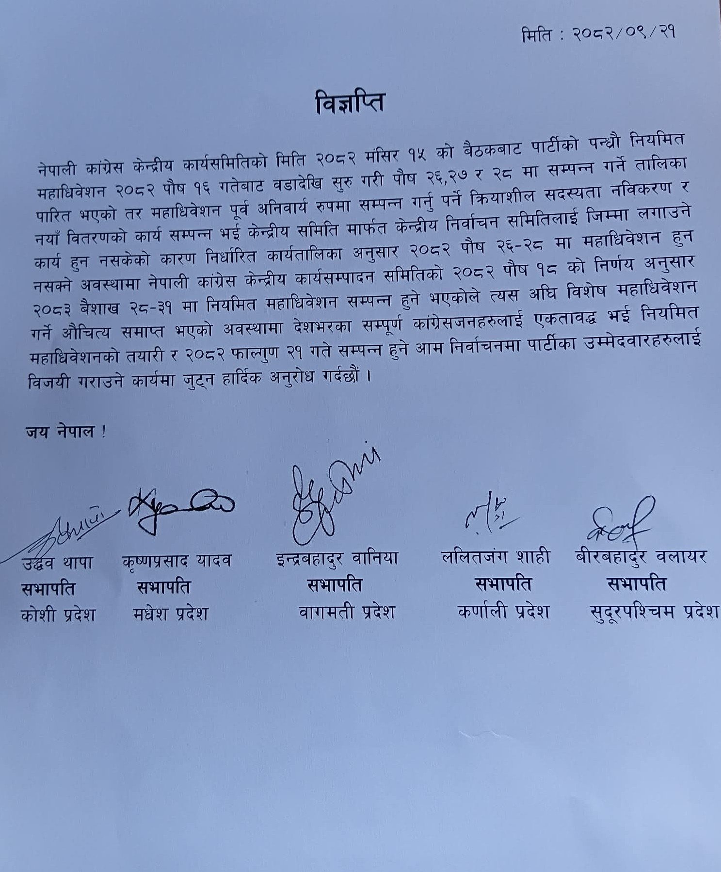 काठमाडौं । नेपाली कांग्रेसका ५ प्रदेश सभापतिहरूले विशेष महाधिवेशनको औचित्य समाप्त भइसकेको घोषणा गर्दै नेता–कार्यकर्तालाई निर्वाचन तयारीमा जुट्न आह्वान गरेका छन्। कोशी प्रदेश सभापति उद्धव थापा, मधेस सभापति कृष्ण यादव, बागमती सभापति इन्द्रबहादुर बानियाँ, कर्णाली सभापति ललितजंग शाही र सुदूरपश्चिम सभापति वीरबहादुर बलायरले सोमबार संयुक्त विज्ञप्ति जारी गर्दै यस्तो बताएका हुन्।