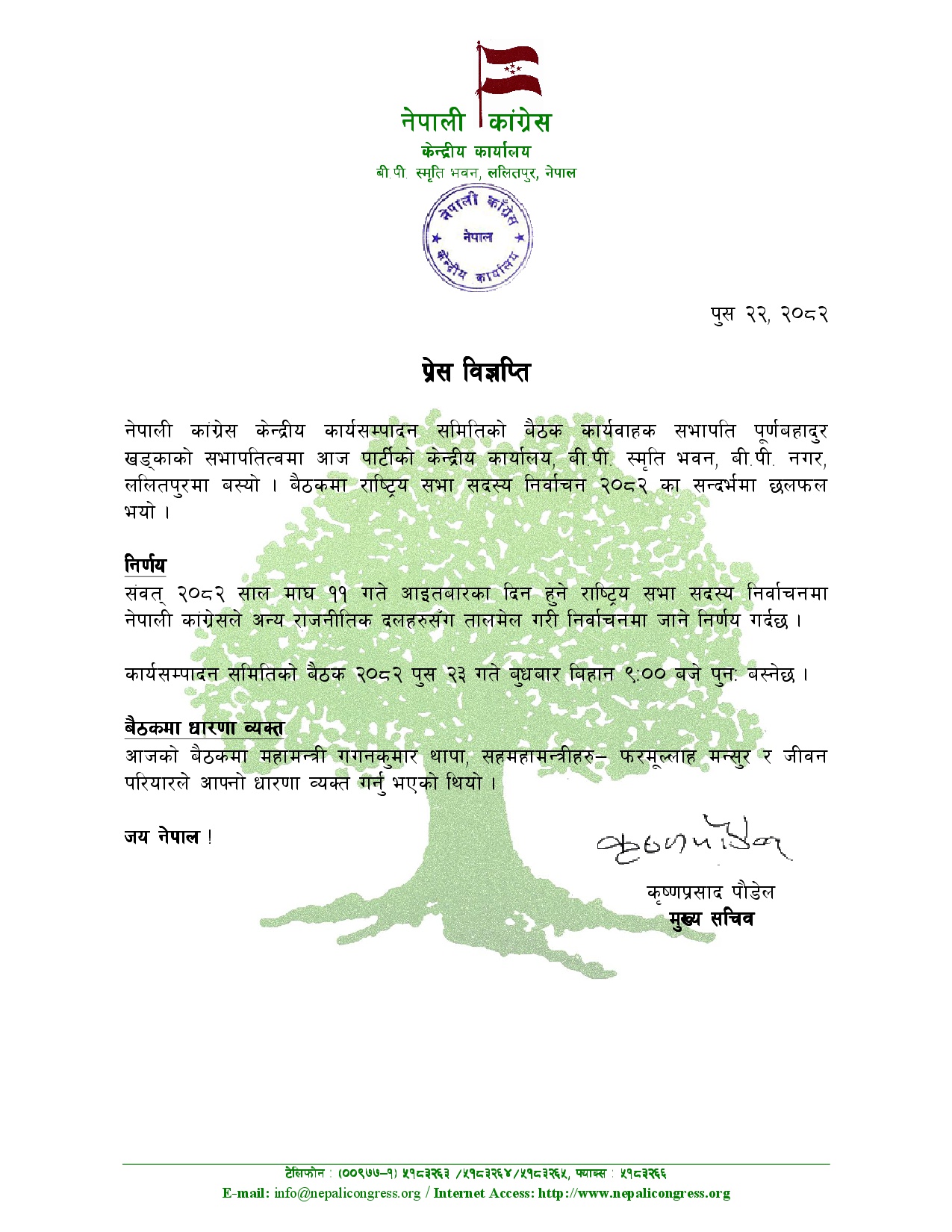 विज्ञप्तिअनुसार कांग्रेस केन्द्रीय कार्यसम्पादन समितिको अर्को बैठक पुस २३ गते बुधबार बिहान ९ बजे पुनः बस्नेछ।आजको बैठकमा महामन्त्री गगनकुमार थापा तथा सहमहामन्त्रीहरू फरमुल्लाह मन्सुर र जीवन परियारले आ–आफ्नो धारणा राखेका थिए।
