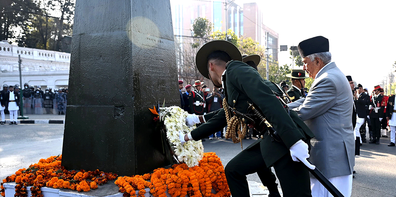 सिंहदरवारको पश्चिमद्वार नजिक रहेको राष्ट्र निर्माताको सालिकमा पुष्पहार अर्पण गरी उनको योगदानको सम्मान गरेका हुन् । त्यस अवसरमा नेपाली सेनाको एक टुकडीले राष्ट्रपतिप्रति सलामी अर्पण गरेको थियो ।