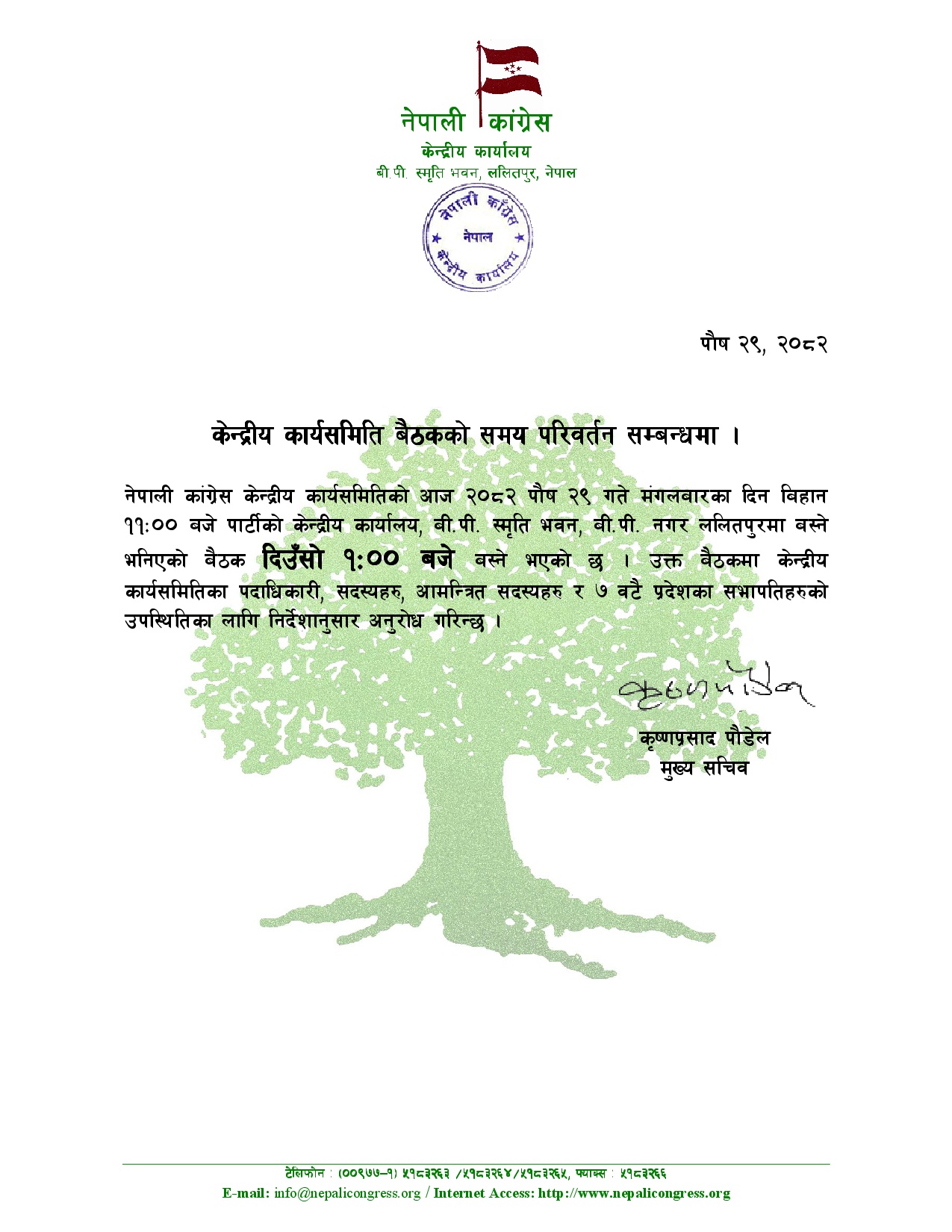 काँग्रेसका मुख्यसचिव कृष्णप्रसाद पौडेलका अनुसार आज बिहान ११ बजेका लागि वोलाइएको बैठक दिउसो १ बजेसम्मका लागि सारिएको हो ।