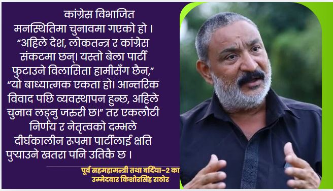 कांग्रेस विभाजित मनस्थितिमा चुनावमा गएको हो कि भन्ने प्रश्नमा राठोरले अस्वीकार गरे। “अहिले देश, लोकतन्त्र र कांग्रेस संकटमा छन्। यस्तो बेला पार्टी फुटाउने विलासिता हामीसँग छैन,” उनले भने, “यो बाध्य एकता हो। आन्तरिक विवाद पछि व्यवस्थापन हुन्छ, अहिले चुनाव लड्नु जरुरी छ।” तर उनले चेतावनी पनि दिए—एकलौटी निर्णय र नेतृत्वको दम्भले दीर्घकालीन रूपमा पार्टीलाई क्षति पुर्याउन सक्नेछ। अन्ततः, किशोरसिंह राठोरको भनाइले कांग्रेसभित्रको यथार्थ चित्र देखाउँछ—चुनावी मैदानमा देखिने एकता सतहमात्र हो, भित्रभित्रै नेतृत्व र वैधानिकताको संघर्ष अझै सकिएको छैन। अदालतको फैसला र चुनावी नतिजाले नै कांग्रेसको आगामी दिशा तय गर्नेछ।