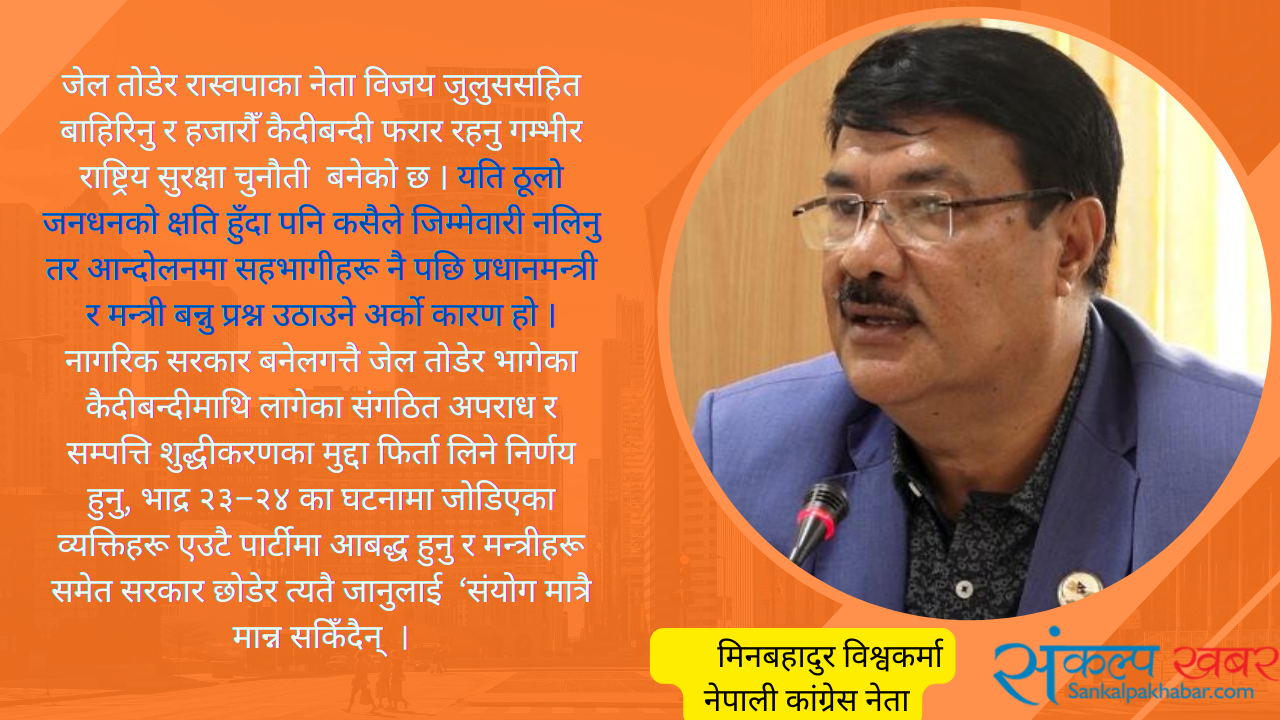 काठमाडौं । नेपाली कांग्रेसका नेता तथा पूर्व विभागीय प्रमुख मिनबहादुर विश्वकर्माले भाद्र २३ र २४ गते भएका घटनाक्रमलाई ‘कहालीलाग्दो नाटक’को संज्ञा दिँदै त्यसको पृष्ठभूमि, नियत र पात्रहरूबारे गम्भीर प्रश्न उठाएका छन् ।