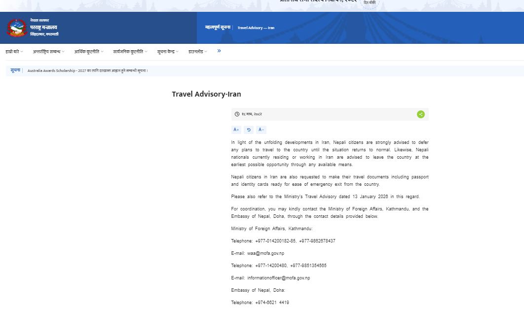 इरानमा रहेका नेपाली नागरिकहरूलाई पनि देशबाट आपतकालीन निकासको लागि राहदानी र परिचयपत्र लगायतका आफ्नो यात्रा कागजातहरू तयार राख्न मन्त्रालयले अनुरोध गरेको छ ।इरानमा लगातार भइरहेको सरकार विरोधी प्रदर्शन र अमेरिकाले इरानमाथि आक्रमण गर्ने तयारी गरेको अवस्थामा मन्त्रालयले इरानमा रहेका नेपाली नागरिकलाई सतर्क गराएको हो ।