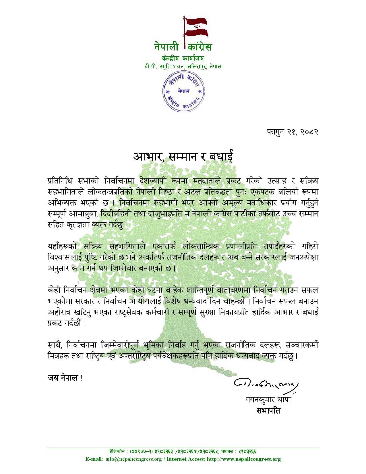 नेपाली कांग्रेस केन्द्रीय कार्यालयले मतदातालाई धन्यवाद दिँदै भनेको छ कि निर्वाचनमा सहभागी भएर आफ्नो अमूल्य मत प्रयोग गर्ने सम्पूर्ण नागरिक प्रति पार्टीको उच्च सम्मान र कृतज्ञता व्यक्त गर्दछ। यस सहभागिताले न केवल लोकतान्त्रिक प्रणालीप्रति जनताको गहिरो विश्वास पुष्टि गरेको छ, तर राजनीतिक दलहरू र नयाँ बन्ने सरकारलाई जनअपेक्षाअनुसार काम गर्न थप जिम्मेवार बनाएको छ।