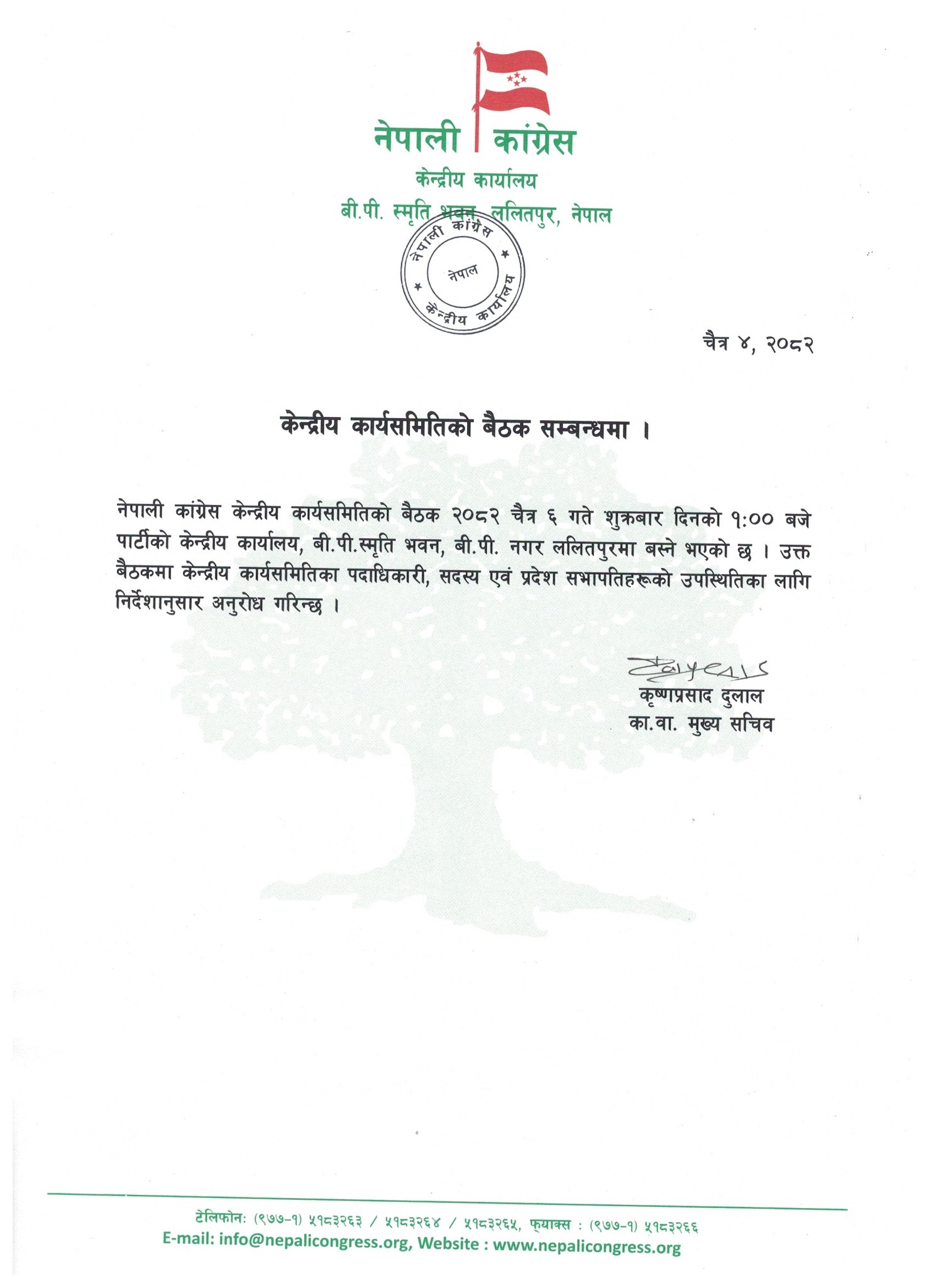 काँग्रेसले शुक्रबार दिनको १ बजे पार्टीको केन्द्रीय कार्यालय, सानेपामा बस्ने गरि केन्द्रीय समितिको बैठक बोलाएको कावा मुख्य सचिव कृष्णप्रसाद दुलालले जानकारी दिएका छन् ।