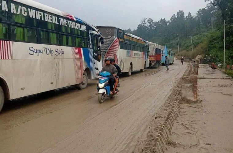 ‘हल्का वर्षामा पनि गाडी चिप्लिएर गुड्न सकेका छैनन्, हिलो बाटोमा सवारीसाधन फसेर समस्या भएको छ’, प्रहरी उपरीक्षक खड्काले भने, ‘पूर्वबाट पश्चिम जाने सवारीहरू उकालोमा चिप्लिएकाले अहिले सडक अवरुद्ध भएको छ ।’