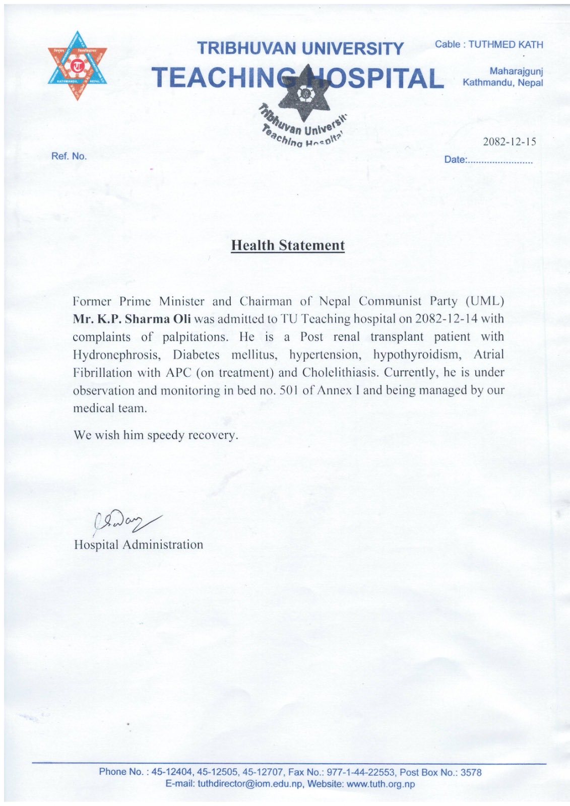 त्रिभुवन विश्वविद्यालय शिक्षण अस्पतालले अध्यक्ष ओलीको स्वास्थ्यस्थितिबारे केहीबेरअघि एक विज्ञप्ति जारी गर्दै उनी चिकित्सकको अवलोकन एवं निगरानीमा रहेको जनाएको छ । “हाम्रो चिकित्सक टोलीद्वारा उपचार व्यवस्थापन भइरहेको छ”, अस्पतालले उनको शीघ्र स्वास्थ्यलाभको कामना गर्दै जारी गरेको विज्ञप्तिमा भनिएको छ ।