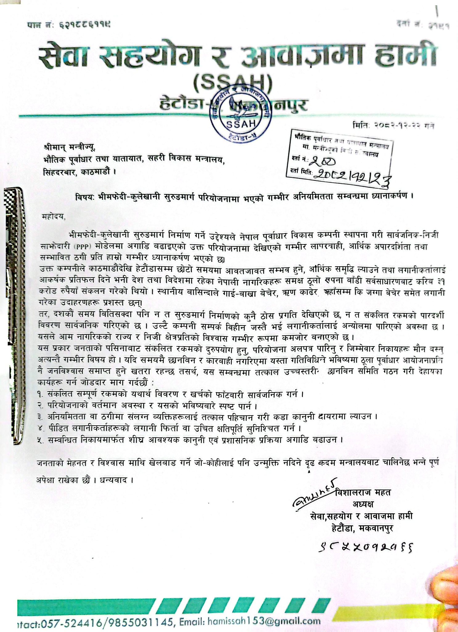 उनका अनुसार सो विषयमा भौतिक पूर्वाधार तथा यातायात मन्त्रालयमा मन्त्रीसमक्ष औपचारिक रूपमा ध्यानाकर्षण गराइएको छ। ध्यानाकर्षण पत्र मन्त्रालयको सचिवालयमा दर्ता भइसकेको र आवश्यक प्रक्रिया पूरा गर्दै कार्यान्वयन तहमा अगाडि बढिसकेको जानकारी पनि उनले दिएका छन्।