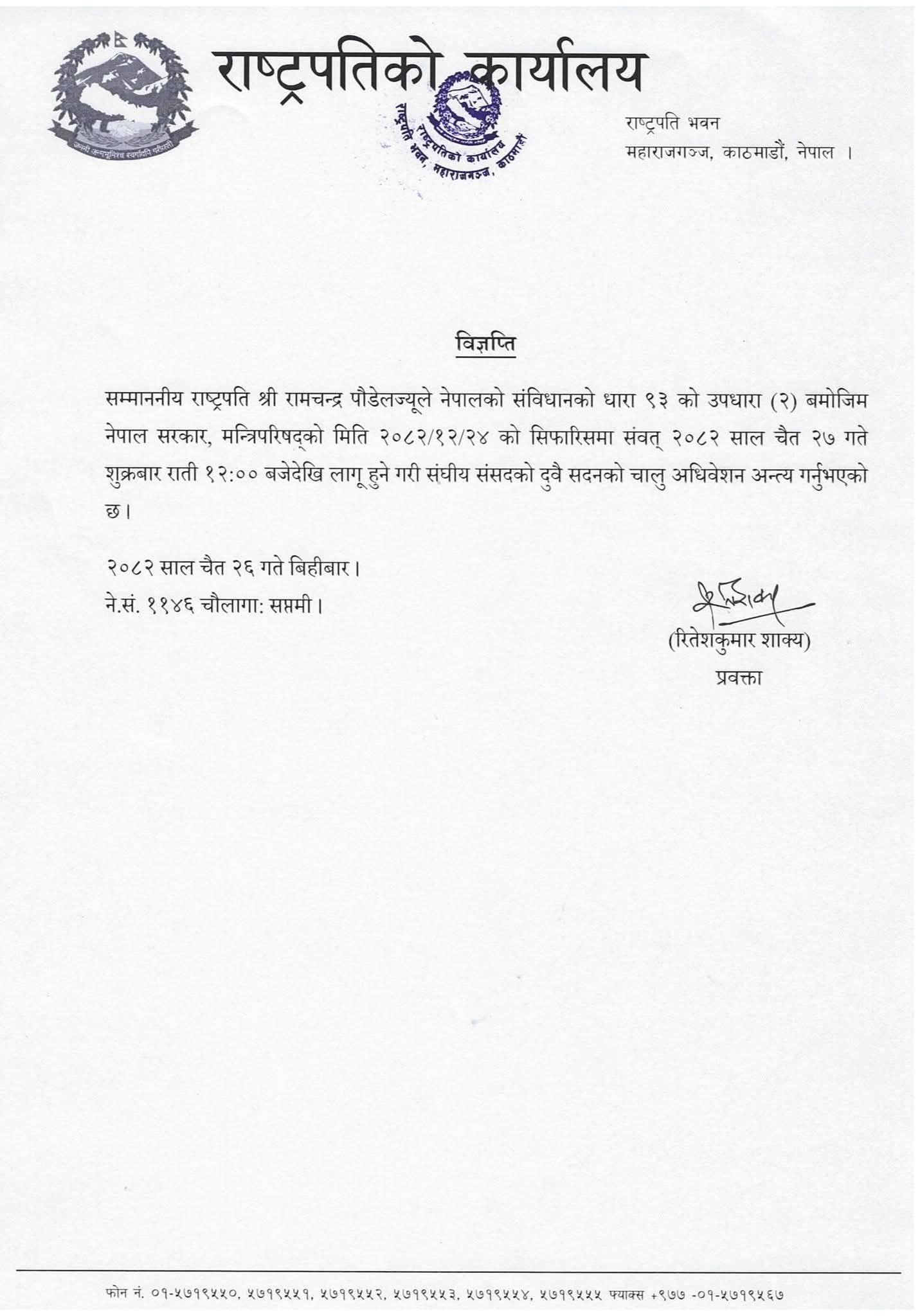 नेपालको संविधानको धारा ९३ को उपधारा (२) बमोजिम नेपाल सरकार, मन्त्रिपरिषद्को यही चैत २४ गतेको निर्णय र सिफारिसमा अधिवेशन अन्त्य गर्ने निर्णय गरेको राष्ट्रपतिको कार्यालयले जनाएको छ ।