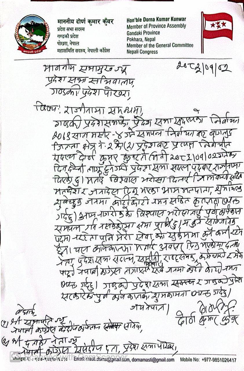 नेपाली कांग्रेसका गण्डकी प्रदेशसभा सदस्य द्रोणकुमार कुँवरले पदबाट राजीनामा दिएका हुन्। बागलुङ क्षेत्र नम्बर २ (२) बाट प्रत्यक्ष निर्वाचित कुँवरले गण्डकी प्रदेशसभाका सभामुखलाई सम्बोधन गर्दै बुधबार राजीनामा बुझाएका छन्।