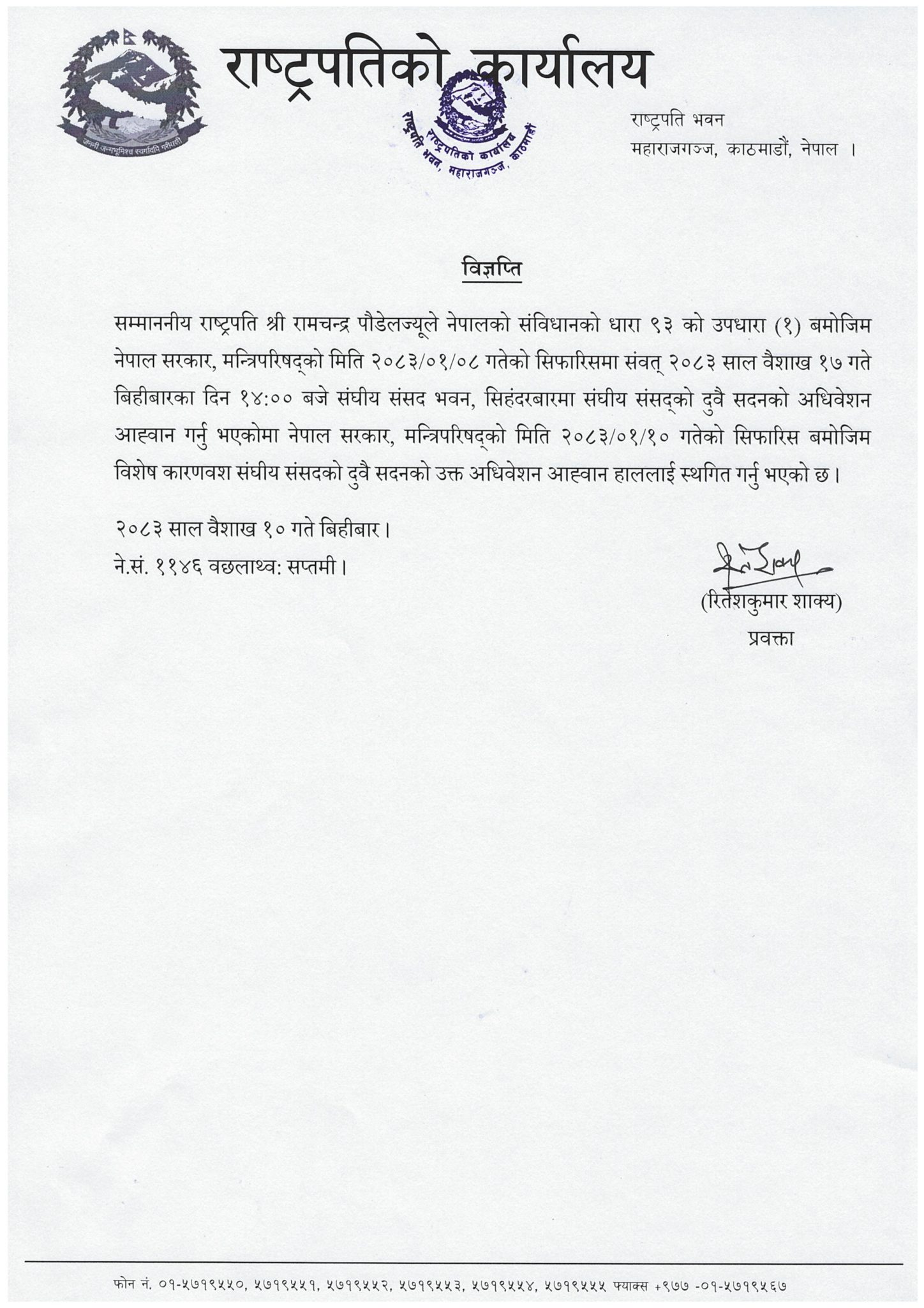 सरकारको सिफारिसअनुसार राष्ट्रपति रामचन्द्र पौडेलले संघीय संसद्को दुवै सदनको अधिवेशन स्थगन गरेका हुन् । शीतल निवासबाट जारी विज्ञप्तिमा ‘विशेष कारणवश’ भन्दै अधिवेशन स्थगन गरिएको उल्लेख छ ।