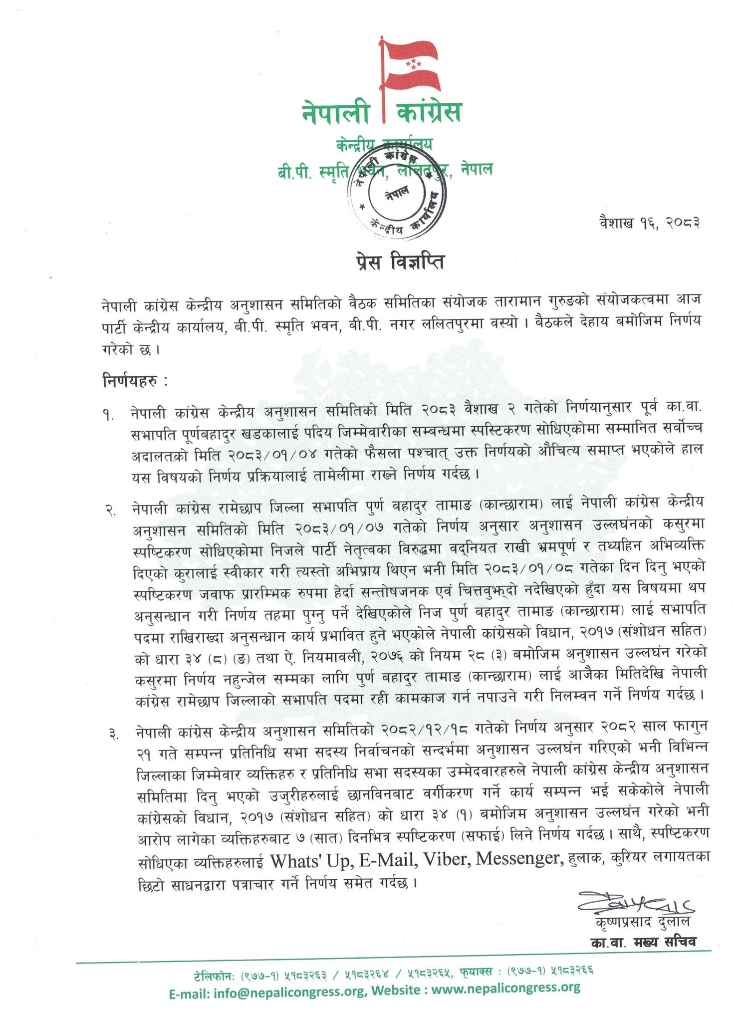 २. नेपाली कांग्रेस रामेछाप जिल्ला सभापति पुर्ण बहादुर तामाङ (कान्छाराम) लाई नेपाली कांग्रेस केन्द्रीय अनुशासन समितिको मिति २०८३÷०१÷०७ गतेको निर्णय अनुसार अनुशासन उल्लघंनको कसुरमा स्पष्टिकरण सोधिएकोमा निजले पार्टी नेतृत्वका विरुद्धमा वद्नियत राखी भ्रमपूर्ण र तथ्यहिन अभिव्यक्ति दिएको कुरालाई स्वीकार गरी त्यस्तो अभिप्राय थिएन भनी मिति २०८३÷०१÷०८ गतेका दिन दिनु भएको स्पष्टिकरण जवाफ प्रारम्भिक रुपमा हेर्दा सन्तोषजनक एवं चित्तवुझ्दो नदेखिएको हुँदा यस विषयमा थप अनुसन्धान गरी निर्णय तहमा पुग्नु पर्ने देखिएकोले निज पुर्ण बहादुर तामाङ (कान्छाराम) लाई सभापति पदमा राखिराख्दा अनुसन्धान कार्य प्रभावित हुने भएकोले नेपाली कांग्रेसको विधान, २०१७ (संशोधन सहित) को धारा ३४ (८) (ङ) तथा ऐ. नियमावली, २०७६ को नियम २८ (३) बमोजिम अनुशासन उल्लघंन गरेको कसुरमा निर्णय नहुन्जेल सम्मका लागि पुर्ण बहादुर तामाङ (कान्छाराम) लाई आजैका मितिदेखि नेपाली कांग्रेस रामेछाप जिल्लाको सभापति पदमा रही कामकाज गर्न नपाउने गरी निलम्वन गर्ने निर्णय गर्दछ ।