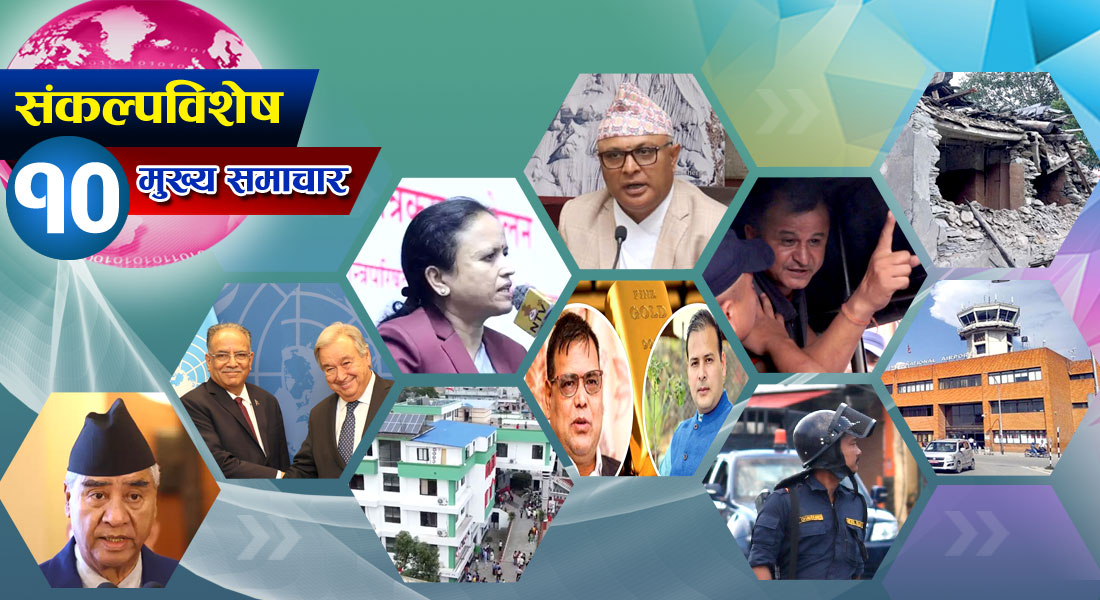 असोज १७ गते बुधबार संकल्प खबरले दिनभरि देशभरमा भएका १० मुख्य समाचार तयार पारेको छ । दिनभरी घटेका घटनालाई एक साथ हेर्न मिल्नेगरी संकल्प विशेष १० समाचारमा मुलुकमा घटेका मुख्य समाचारलाई समेटिएको हो । बुधबार तयार पारिएको मुख्य १० समाचारमा धर्म एवं सम्प्रदायबीचको आपसी एकता र सद्भाव कायम राख्ने कार्यमा जुट्न सभापति देउवाको अपिलदेखीविमानस्थलबाट अवैध मुद्रासहित अमेरिकी नागरिक पक्राउसम्मका समाचारलाई समेटिएको छ ।