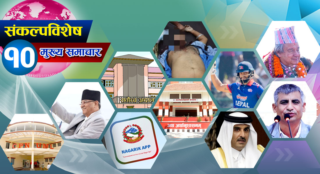 कार्तिक १३ गते सोमबार संकल्प खबरले दिनभरी घटेका मुख्य १० मुख्य समाचार तयार पारेको छ । दिनभरी घटेका घटनालाई एक साथ हेर्न मिल्नेगरी संकल्प विशेष १० समाचारमा मुलुकमा घटेका मुख्य समाचारलाई समेटिएको हो । सोमबार तयार पारिएको मुख्य १० समाचारमा एमालेका सबै जिल्ला कमिटीको अधिवेशन माघ महिनाभित्र गर्ने देखी एमालेविना कोशी सरकार नचल्ने मुख्यमन्त्री कार्कीको सन्देशसमाचारलाई समेटिएको छ ।