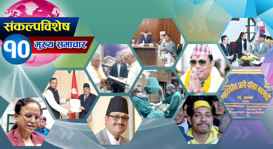 कार्तिक २३ गते बिहीबार संकल्प खबरले दिनभरी घटेका मुख्य १० मुख्य समाचार तयार पारेको छ । दिनभरी घटेका घटनालाई एक साथ हेर्न मिल्नेगरी संकल्प विशेष १० समाचारमा मुलुकमा घटेका मुख्य समाचारलाई समेटिएको हो । बिहीबार तयार पारिएको मुख्य १० समाचारमा भुटानी शरणार्थी प्रकरण :सानु भण्डारीसहित ५ जनाले दिए बयानदेखी सामाजिक सञ्जाल सञ्चालन निर्देशिका मन्त्रिपरिषदबाट स्वीकृतसम्मका समाचारलाई समेटिएको छ ।