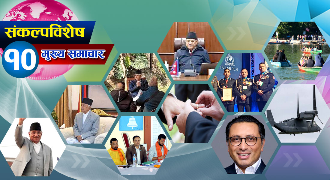 मंशिर १३ गते बुधबार संकल्प खबरले दिनभरी घटेका मुख्य १० मुख्य समाचार तयार पारेको छ । दिनभरी घटेका घटनालाई एक साथ हेर्न मिल्नेगरी संकल्प विशेष १० समाचारमा मुलुकमा घटेका मुख्य समाचारलाई समेटिएको हो । बुधबार तयार पारिएको मुख्य १० समाचारमा राष्ट्रपति पौडेलसँग प्रधानमन्त्रीको भेटवार्ता देखी जापानमा अमेरिकी सेनाको विमान दुर्घटना, आठ जनाको मृत्यु सम्मका समाचारलाई समेटिएको छ ।
