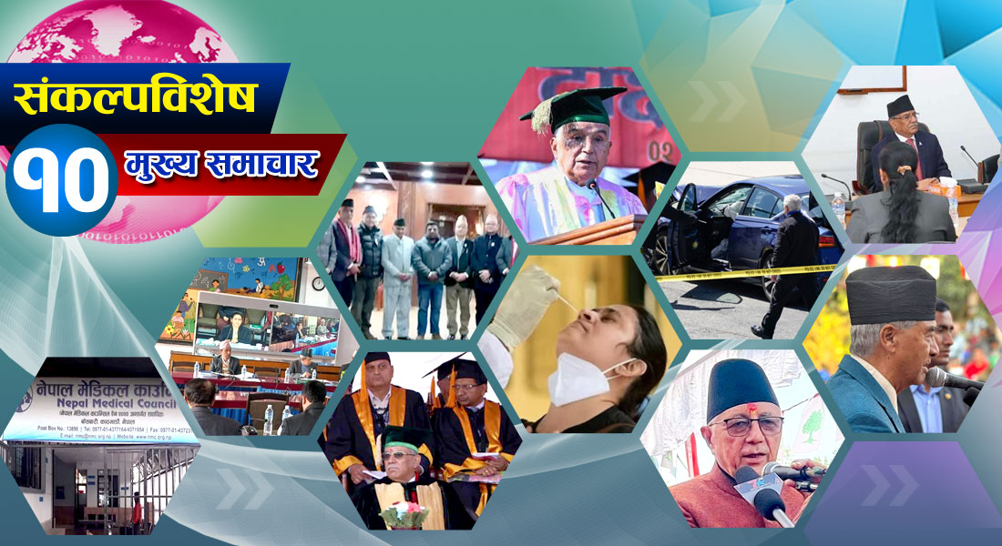 पौष २ गते सोमबार संकल्प खबरले दिनभरी घटेका मुख्य १० मुख्य समाचार तयार पारेको छ । दिनभरी घटेका घटनालाई एक साथ हेर्न मिल्नेगरी संकल्प विशेष १० समाचारमा मुलुकमा घटेका मुख्य समाचारलाई समेटिएको हो । सोमबार तयार पारिएको मुख्य १० समाचारमा आगामी निर्वाचनमा ठूलो पार्टी बनाउन एकसाथ अघि बढ्न नेता कार्यकर्तालाई सभापति देउवाको आग्रहदेखी चिकित्सक लाइसेन्स परीक्षाका लागि आजदेखि आवेदन खुला सम्मका समाचारलाई समेटिएको छ ।