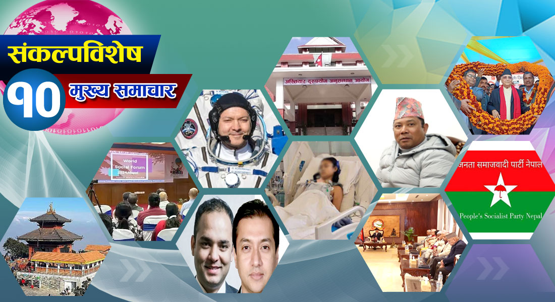 माघ २५गते बिहीबार संकल्प खबरले दिनभरी घटेका मुख्य १० मुख्य समाचार तयार पारेको छ । दिनभरी घटेका घटनालाई एक साथ हेर्न मिल्नेगरी संकल्प विशेष १० समाचारमा मुलुकमा घटेका मुख्य समाचारलाई समेटिएको हो । बिहीबार तयार पारिएको मुख्य १० समाचारमा नगर विकास समितिका अध्यक्षसहित २४९ जनाविरुद्ध भ्रष्टाचार मुद्दा देखि विश्व सामाजिक मञ्चको १६औँ सम्मेलन सम्मका समाचार समेटिएको छ ।