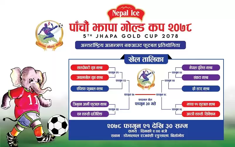 झापा । नेपाल आइस पाँचौँ झापा गोल्ड कप २०७८ को खेलमा नेपाल र भारतका १० टोली सहभागी हुने भएका छन् । गत वर्ष कोभिडका कारण रोकिएको गोल्डकप यस वर्ष यही फागुन २१ देखि ३० गतेसम्म सञ्चालन गर्ने तयारी भइरहेको छ ।