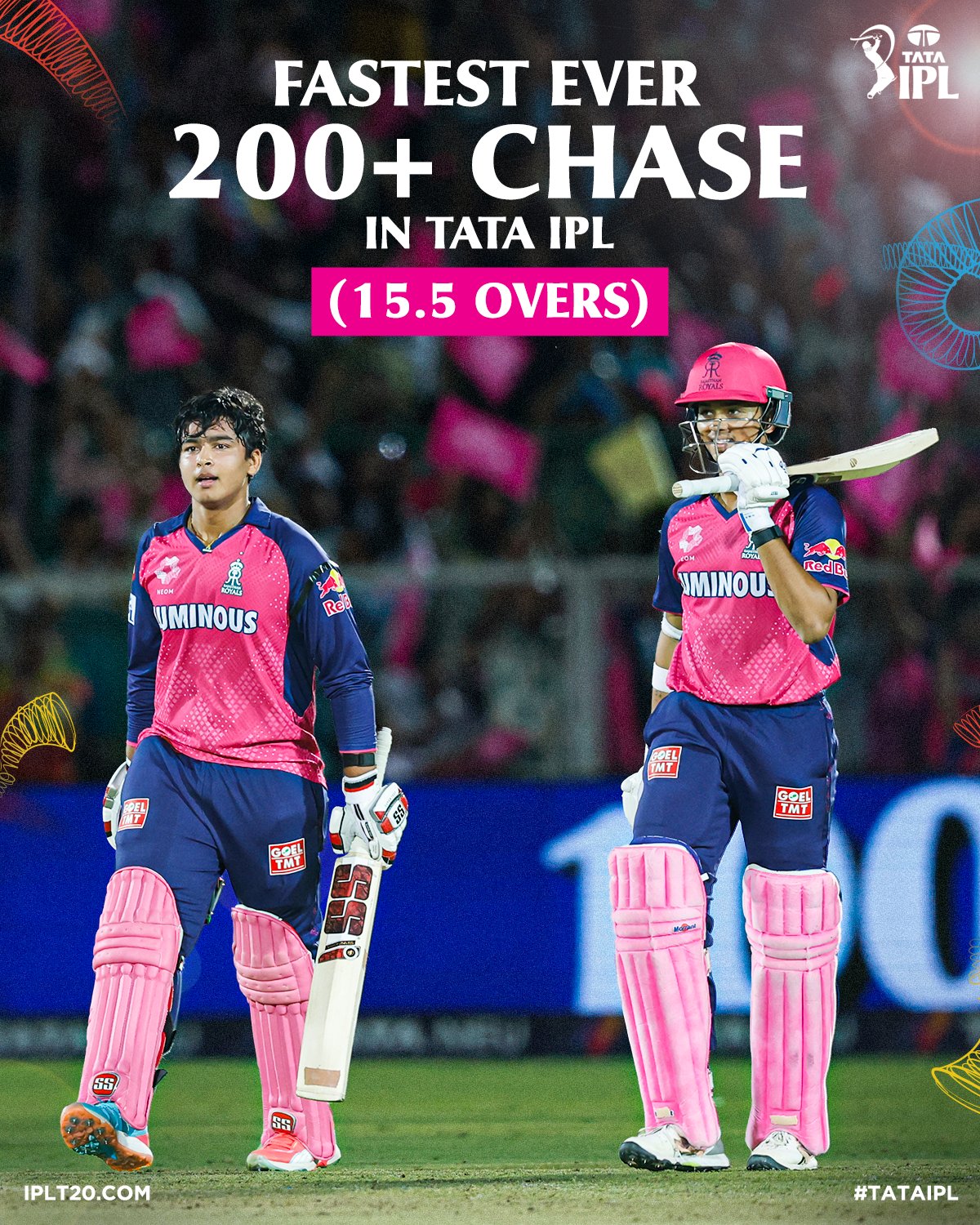 वैभवका अलावा यशस्वी जैसवालले पनि अर्धशतक बनाउन सफल भए । जैसवालले ४० बलमा ७० रनको उत्कृष्ट अविजित इनिङ खेले । ९ चौका बाहेक उनले २ छक्का समेत प्रहार गरेका छन् । अन्ततः राजस्थानले १५.५ ओभरमा २१२ रन बनाएर ८ विकेटले ऐतिहासिक जित दर्ता गरेको हो ।
