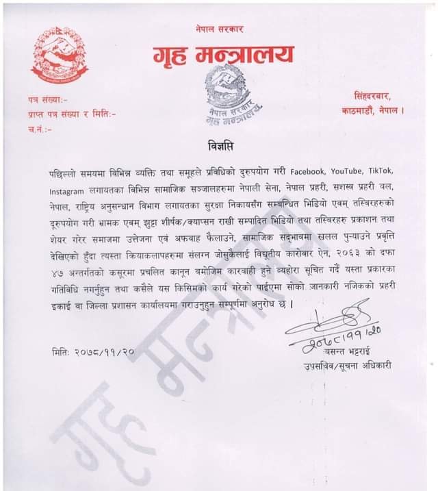 नेपाली सेना, नेपाल प्रहरी र अनुसन्धान विभागका तस्विर भिडियोहरुलाई दुरुपयोग गरेर सामाजिक सञ्जालमा भ्रमपुर्ण प्रचार गर्ने प्रयोगकर्ताहरुलाई मन्त्रालयले कारबाही गर्ने चेतावनी दिएको हो ।