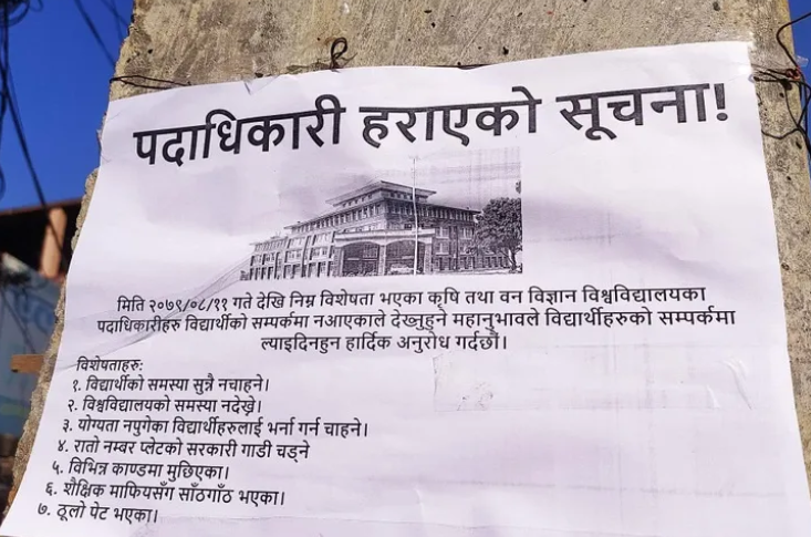 विभिन्न माग राख्दै एक सातादेखि आन्दोलन गर्दै आएको संयुक्त विद्यार्थी संगठनले विश्वविद्यालयका पदाधिकारी हराएको भन्दै सूचना टाँस गरेको हो ।