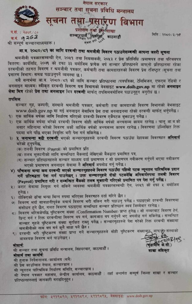 काठमाडौं । सुचना तथा प्रसारण विभागले दरबन्दी तथा श्रमजीवी विवरण नविकरण गर्न आह्वान गरेकाे छ । विभागले मंगलबार विज्ञप्ती जारी गर्दै सबै संचारमाध्यमहरुलाई नविकरणका लागि सुचना जारी गरेको हो । सुचना तथा प्रसारण विभागले प्रत्येक वर्ष सबै आमसंचारमाध्यमहरुको विवरण अध्यावधिक गर्दै आएको छ ।